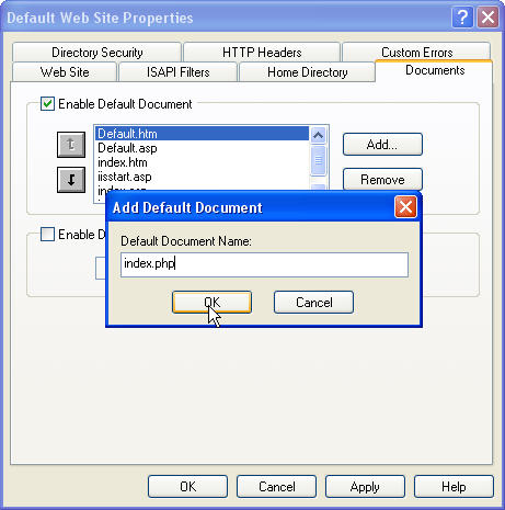 10 点击 文档 标签,再点 添加 按钮,在弹出的 添加默认文档 对话框中,填入index.php