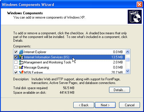 2 依次在 控制面板 > 添加与删除 > 添加/删除Windows组件 > Windows组件向导 中选中 Internet信息服务(IIS)