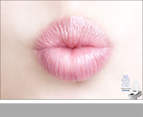 广告语:We love your tush Coway Electronic Bidets 我们热爱你的屁股。Coway自动清洗马桶。广告分为“kiss man”和“kiss woman”两部分。