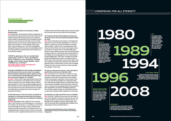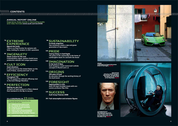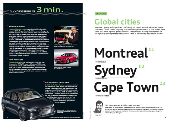 新字族的展现效果可以在“奥迪2008年年度报告(PDF)奥迪2008年年度报告(PDF)”全文中看到。其效果是时尚的外观与奥迪车融合得非常好。